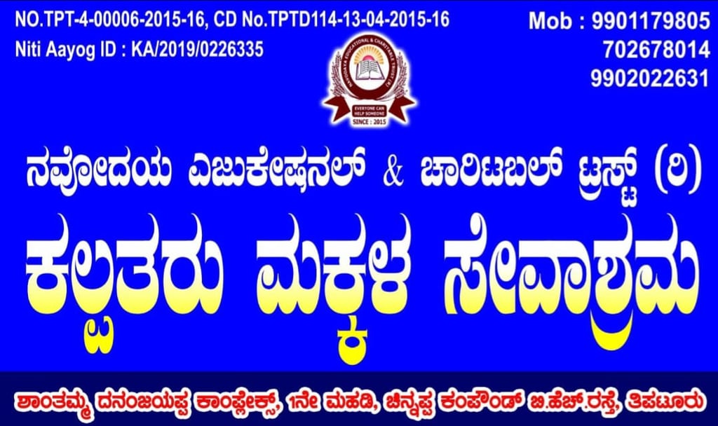 Navodaya Educational and Charitable Trust is a non-governmental trust established in 2015 in Tiptur, Tumkur district, Karnataka. The trust focuses on various areas, including education, agriculture, children's welfare, and community development. Their initiatives include educational kits and dry ration distribution, eye checkup camps, medical checkup camps, cloth distribution, and tree plantation
